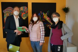 Geschäftsführer Carsten Jochum (links) und die Betriebsratsvorsitzende Ruth Venus (rechts) beglückwünschen Susanne Kellersohn von der psychosomatischen Station P1 (Mitte, 35 Jahre Firmenzugehörigkeit) symbolisch für alle Jubilare 2021 an ihrem Arbeitsplatz.
