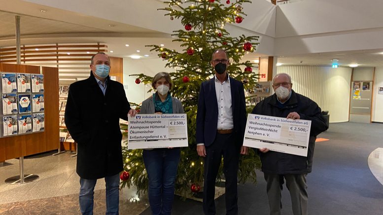 Traditionell verzichtet die Volksbank in Südwestfalen eG auf Weihnachtsgeschenke für Kunden und Geschäftspartner zugunsten einer Weihnachtsspende an karitative Einrichtungen. In diesem Jahr geht die Spendensumme von 10.000 Euro zu gleichen Teilen an vier Vereine aus dem Märkischen Kreis und dem Siegerland, die sich den Themen Demenzerkrankung und Entlastung der Angehörigen widmen: die Atempause Hüttental – Ökumenischer Entlastungsdienst e. V., VergissMeinNicht Netphen e. V. sowie die Arche Lüdenscheid gGmbH für das Demenzcafé Ankerplatz und den Treffpunkt-Demenz-Balve e. V.