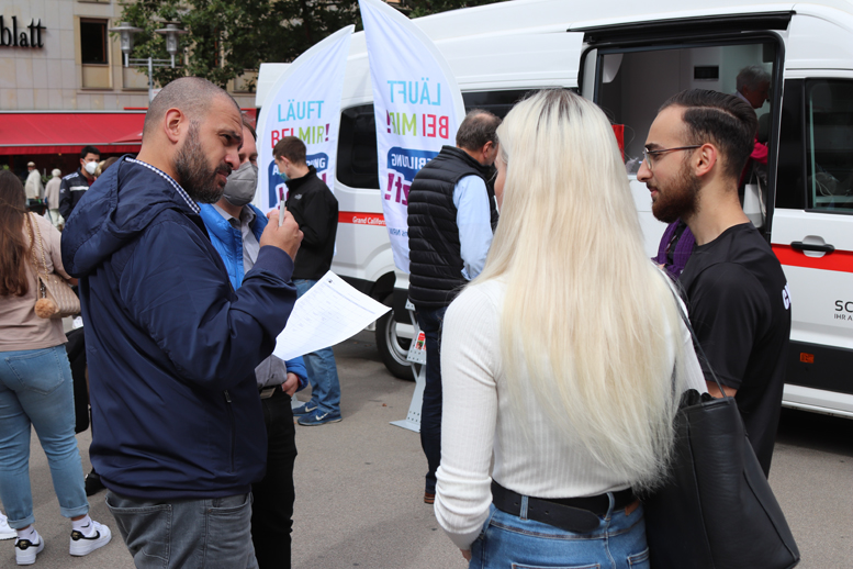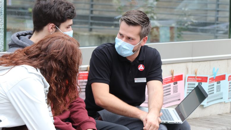 Jana aus Siegen-Geisweid hat vor zwei Jahren ihr Fachabitur gemacht und anschließend im Einzelhandel gearbeitet. Jetzt steht sie im Nieselregen auf der Siegbrücke und unterhält sich fast eine Stunde lang mit Burhan Demir, Ausbildungsberater bei der IHK Siegen. „Er war total nett“, sagt die 21-Jährige im Anschluss. „Tatsächlich habe ich mich auf eine Stelle als Industriekauffrau beworben aber da eine Absage bekommen. Jetzt hat mir der Berufsberater noch ein paar freie Stellen gezeigt. Ich möchte auf jeden Fall eine Ausbildung machen – das ist eine Absicherung.“
