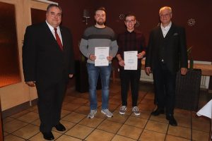 Zudem konnte das Innungsoberhaupt in diesem Jahr einen besonderen Gast begrüßen: Der Prüfungsbeste aus dem letzten Jahr, Nils Beckmann aus Lennestadt, war in diesem Jahr als Ehrengast vor Ort. Er wurde Zweiter im Bundeswettbewerb seines Handwerks und ist damit ein Vorbild für die diesjährigen Absolventen. Er bekam von der Innung ein Präsent für seine tolle Leistung überreicht. Aktuell können Steven Maczuch (Hees Bürowelt GmbH, Siegen) als Informationselektroniker mit Fachrichtung Bürosystemtechnik und Joshua Kexel (Achim Opfer, Hof) als Informationstechniker mit Fachrichtung Geräte- und Systemtechnik über die besten Ergebnisse der Wintergesellenprüfung 2019/2020 freuen. Auch für sie hatte Stefan Jaeger im Namen der Innung ein Geschenk als Anerkennung parat.