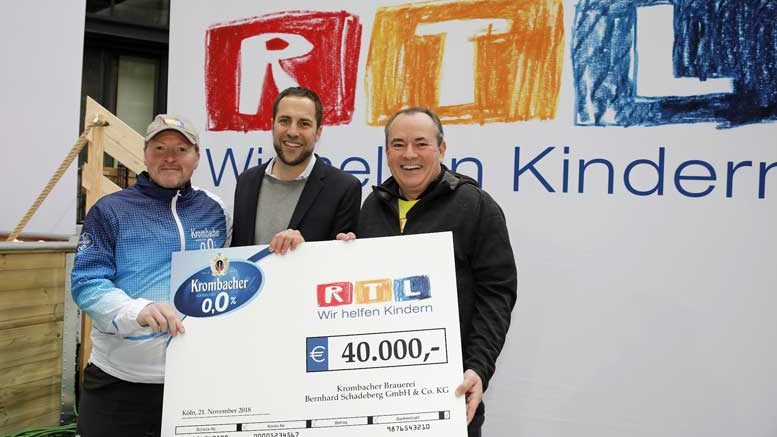 Sportliches und gesellschaftliches Engagement für notleidende Kinder: Auch in diesem Jahr konnte die Krombacher Brauerei Gutes tun und im Rahmen des RTL-Spendenmarathons den Organisatoren einen Spendenscheck in Höhe von 40.000 Euro überreichen. Bei einem 24-Stunden-Hindernislauf wurden auf dem Gelände der Mediengruppe RTL vom 22. bis zum 23. November zahlreiche Kilometer zurückgelegt und auch wieder ein neuer Weltrekord aufgestellt.