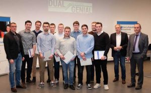 Im Berufskolleg Technik erhielten auch die Teilnehmer des ersten Jahrgangs des kombinierten Ausbildungs- und Studienmodells „Dual Genial“ ihre IHK- und Berufsschulabschlusszeugnisse. Das Modell basiert auf einer Kooperation zwischen IHK Siegen, Universität Siegen und Berufskolleg Technik. Parallel zur nun abgeschlossenen Ausbildung studieren die Absolventen Maschinentechnik an der Universität Siegen. Nach 2,5 Jahren schließt die verkürzte Ausbildung zum Industriemechaniker ab, nach insgesamt 4,5 Jahren ist der Bachelor of Science erreicht. Den Erfolg des Modells belegt das sehr gute IHK-Prüfungsergebnis der zehn Teilnehmer mit sehr guten 93 % im Durchschnitt. IHK-Geschäftsführer Klaus Fenster appellierte an die heimischen Ausbildungsbetriebe, sich an diesem Programm zu beteiligen.