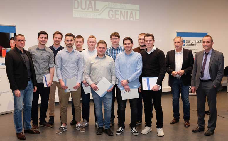 Im Berufskolleg Technik erhielten auch die Teilnehmer des ersten Jahrgangs des kombinierten Ausbildungs- und Studienmodells „Dual Genial“ ihre IHK- und Berufsschulabschlusszeugnisse. Das Modell basiert auf einer Kooperation zwischen IHK Siegen, Universität Siegen und Berufskolleg Technik. Parallel zur nun abgeschlossenen Ausbildung studieren die Absolventen Maschinentechnik an der Universität Siegen. Nach 2,5 Jahren schließt die verkürzte Ausbildung zum Industriemechaniker ab, nach insgesamt 4,5 Jahren ist der Bachelor of Science erreicht. Den Erfolg des Modells belegt das sehr gute IHK-Prüfungsergebnis der zehn Teilnehmer mit sehr guten 93 % im Durchschnitt. IHK-Geschäftsführer Klaus Fenster appellierte an die heimischen Ausbildungsbetriebe, sich an diesem Programm zu beteiligen.
