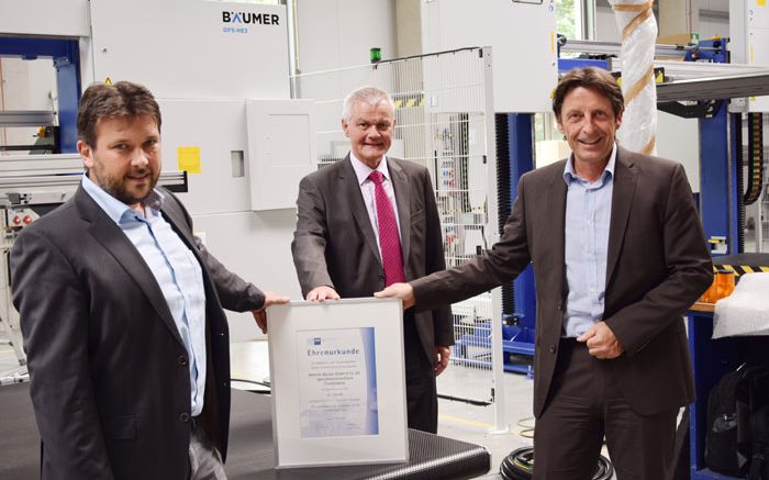 IHK-Hauptgeschäftsführer Klaus Gräbener überbrachte zum Firmenjubiläum die Glückwünsche von Präsidium und Geschäftsführung der heimischen Industrie- und Handelskammer und überreichte eine Ehrenurkunde an CEO Christoph Hauck und CFO Jörgen Hofmann. Zugleich zeigte er sich beeindruckt, dass sich Bäumer im Laufe der Jahre von einem kleinen mittelständischen Unternehmen zu einem weltweiten Marktführer entwickelt habe, der außerordentlich erfolgreich unterwegs sei, seine Produkte heute zu rund 90 Prozent im Ausland absetze und zugleich auch in der betrieblichen Erstausbildung seit Jahrzehnten Maßstäbe setze. Er wünschte Christoph Hauck und Jörgen Hofmann, dass sie die erfolgreiche Firmengeschichte gemeinsam mit den 400 weltweit tätigen Mitarbeiterinnen und Mitarbeitern noch lange fortschreiben können.
