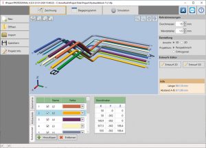 Eine weitere Neuerung der transfluid-Software ist die erweiterte Darstellung des Zeichnungseditors. Hier können neben dem zu zeichnenden Rohr zum Vergleich auch andere Rohre dargestellt werden. Das ist besonders interessant bei der Hydraulikverrohrung, wenn Rohre in Lagen oder Bündeln verlegt werden sollen. Dann wird ein Rohr als Masterteil eingesetzt und alle anderen parallel verlaufenden Rohre hierzu angepasst und auf dem Bildschirm dargestellt. Unterschiede an den Enden können dann entsprechend angepasst werden. Es ergibt sich hierdurch eine starke Vereinfachung der Erstellung von Rohrverläufen und eine zuverlässige Abbildung in der späteren Verrohrung.