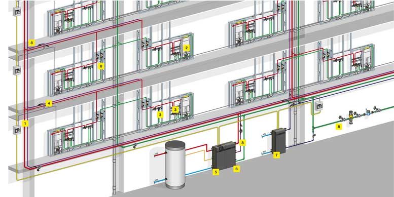 Das Trinkwasser-Management-System „AquaVip Solutions“ wurde gezielt für den Einsatz in Gebäuden mit großen Trinkwasseranlagen konzipiert, wie sie für Krankenhäuser, Alten- und Pflegeheime oder Wohnkomplexe typisch sind. Die produkttechnischen Lösungen mit innovativer Trinkwassererwärmung, Ultrafiltration, thermisch und hydraulisch permanent überwachten Parametern im Trinkwasser und automatischer Unterstützung des bestimmungsgemäßen Betriebs stellen dabei die folgerichtige Ergänzung zur hygienischen Auslegung von Trinkwasseranlagen in solchen Gebäuden dar. Gekennzeichnet sind solche Anlagenplanungen vor allem durch die bedarfsgerechte Dimensionierung des Rohrleitungsnetzes, durch eine möglichst auch baulich thermische Trennung der Rohrleitungsinstallationen für Trinkwasser warm und Trinkwasser kalt sowie eine klare, nachvollziehbare Struktur der Rohrleitungsnetze unter Minimierung des Trinkwasservolumens.