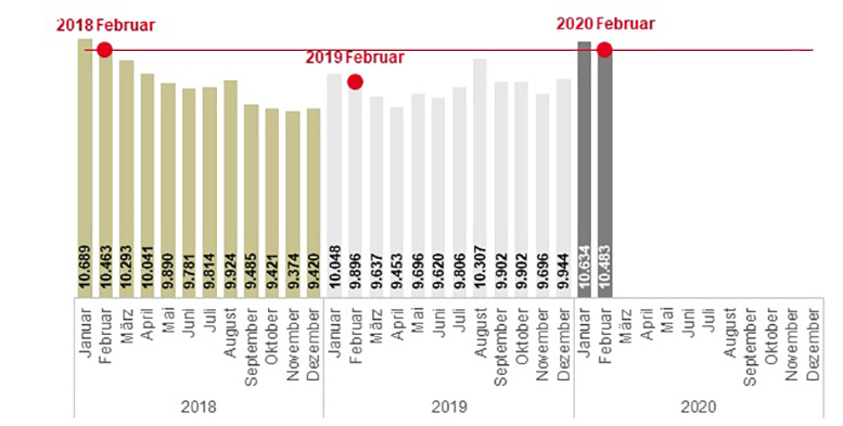 Die Zahl der Arbeitslosen ist im Agenturbezirk Siegen im Februar 2020 wieder etwas gesunken. Insgesamt waren 10.483 Personen arbeitslos gemeldet. Verglichen mit den Zahlen des Vormonates sind dies 151 Personen oder 1,4 Prozent weniger. Im Vergleich zum Februar Vorjahres steigt die Zahl der Arbeitslosen um 587 Personen bzw. 5,9 Prozent. Die Arbeitslosenquote auf Basis aller zivilen Erwerbspersonen beträgt im Februar 4,4 Prozent. Vor einem Jahr belief sie sich auf 4,2 Prozent (+0,2 Prozentpunkte).