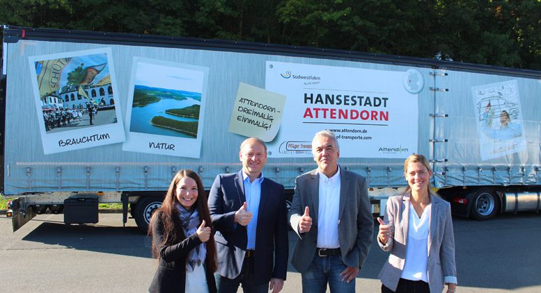 Attendorn, Sauerland, Südwestfalen – das gehört zusammen! Die Pflüger Transporte GmbH aus Attendorn bereichert die Flotte der Südwestfalen-Lkw mit einem sehenswerten Exemplar: Gemeinsam mit der Stadt Attendorn und der Südwestfalen Agentur hat das Transport- und Logistikunternehmen den Auflieger gestaltet, finanziert und umgesetzt. Nun soll der auffällige Lkw europaweit die Blicke auf Vorzüge der Region lenken.