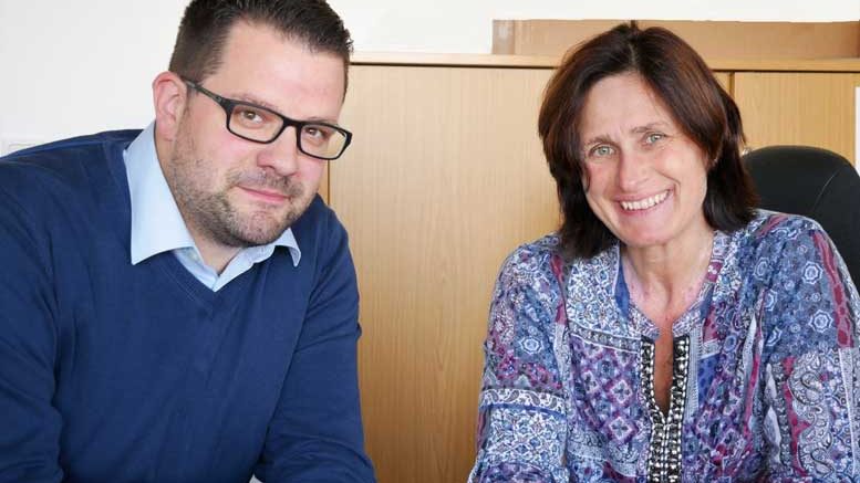 Berufsbildungszentrum (bbz): Weiterbildungsreferentin Claudia Erickson mit ehemaligem Teilnehmer und Dozent des Lehrgangs zum Industriefachwirt.