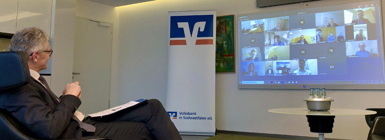 „Das Ihre Prüfung inmitten eines Corona-Lockdowns stattfinden wird, damit haben wir alle zu Beginn Ihrer Ausbildung in unseren kühnsten Träumen nicht gerechnet. Umso erfreulicher ist es, dass Sie trotz aller äußeren Widrigkeiten der letzten Monate am Ball geblieben sind und Ihre Prüfung erfolgreich abschließen konnten“, sagt Volksbank-Vorstandssprecher Karl Michael Dommes. Für den reibungslosen Ablauf der Prüfungen vor der SIHK zu Hagen und der IHK Siegen musste ein eigenes Hygienekonzept entwickelt werden: Kein Zusammenstehen vor und nach den Prüfungen, Maskenpflicht auch am eigenen Platz und eine Plexiglasscheibe zwischen Prüfling und Prüfer. „Zusammen mit der ganz normalen Aufregung war das für Sie alle sicherlich noch einmal eine ganz eigene Herausforderung“, so Dommes weiter. Aufgrund der aktuellen Lage habe man sich für einen digitalen Empfang entschieden. „Ganz sang- und klanglos wollten wir Sie schließlich nicht davonkommen lassen und haben dieses schon länger erprobte Format gewählt.“