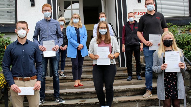 Fünf Mal die Note Sehr gut. Dafür zeichnete EJOT-Geschäftsführerin Angelika Wetzstein vier Auszubildende und einen Dualen Studenten aus. Ihre Ausbildung zur Industriekauffrau haben Sonja Feldbusch (92 Punkte) und Maja Linde (95 Punkte) bestanden; ebenso Philipp Quast, der seine Ausbildung zum Industriekaufmann mit (93 Punkten) absolviert hat. Marius Latt, der zum Produktionsinformatiker ausgebildet wird, hat den ersten Teil, die Ausbildung zum Maschinen- und Anlagenführer, ebenfalls mit sehr guten Leistungen bestanden und erreichte 98 Punkte. Der zweite Bestandteil ist jetzt die Ausbildung zum Fachinformatiker. Christian Berretz hat innerhalb seines Dualen Studiums Wirtschaftsingenieurwesen den Masterstudiengang abgeschlossen. Er erreichte als Gesamtnote die 1,7, die Note der Masterarbeit ist eine glatte 1,0. Aus den Reihen der Ausbilder/-innen und Mentoren gratulierten Andrea Afflerbach, Helmut Zacharias und Daniel Wagner.