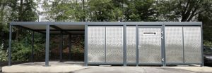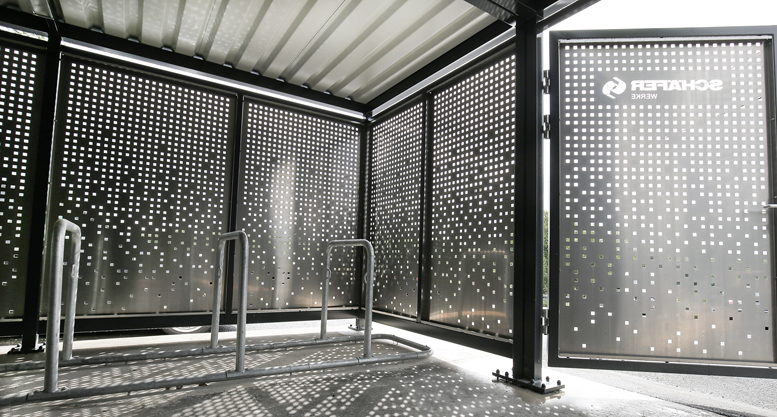 Als markantes Baumaterial haben die Auszubildenden unter anderem perforierte Edelstahlbleche vom gleichnamigen Geschäftsbereich SCHÄFER Lochbleche verwendet. Das optisch ansprechende Design ist auf minimale Wartung und Zugriffssicherheit der Anlage ausgelegt. Aktuell beträgt die Kapazität 34 Stellplätze. Davon sind 24 Stellplätze als Fahrrad- bzw. E-Bike-Stellplätze ausgewiesen, welche mittels Schließsensorik vor unbefugten Fremdzugriffen geschützt sind. Für Motorräder und Roller sind 10 überdachte Außen-Stellplätze in der Anlage vorgesehen. Der Standort der Zweirad-Garage befindet sich am Parkplatz unterhalb der Hauptverwaltung. Der Zugang erfolgt elektronisch per Chip und ist rund um die Uhr möglich.