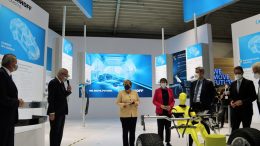 Bundeskanzlerin Angela Merkel lobt die Stärken der deutschen Automobilzuliefererindustrie bei ihrem Besuch auf dem KIRCHHOFF Automotive Messestand auf der IAA Mobility in München. Arndt G….