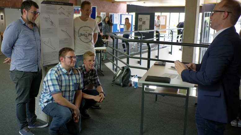 Die Firmen EJOT aus Bad Berleburg und BOMBARDIER aus Dreis-Tiefenbach hatten den Schülern einige Wochen zuvor verschiedene betriebliche Aufträge erteilt: die Entwicklung einer verschließbaren Ladestation für fünf iPads, der Entwurf eines Kleiderbügels mit Firmenlogo als Eyecatcher und die Entwicklung eines Sicherungselementes für die Zentralmutter eines Schienenfahrzeuges. Die Auszubildenden hatten dann die Aufgabe, innerhalb kleiner Arbeitsgruppen eine Lösung zu entwickeln und diese der Auftrag gebenden Firma zu präsentieren. Der besondere Anreiz dabei ist die Chance, dass die entwickelte Lösung hinterher von der Auftragsfirma tatsächlich umgesetzt bzw. weiterentwickelt wird. Die ersten durchweg positiven Rückmeldungen und Anerkennung der Leistungen durch die Ausbilder gab es dann auch immer gleich im Anschluss an die Präsentationen. Gelegenheit zur Klärung weiterer Fragen boten die Pausen, in denen die Schüler an speziell errichteten Infoständen allen Interessierten detaillierte Auskunft über ihre Entwicklungen gaben.