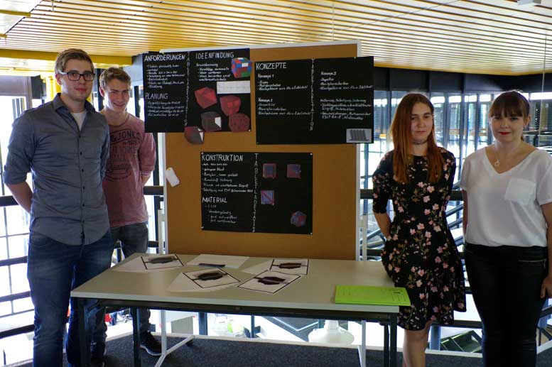 Über wie viel Kreativität, technisches Know-how, Team- und planerische Koordinationsfähigkeit bereits Auszubildende im 1. und 2. Lehrjahr verfügen, das konnten die angehenden technischen Produktdesigner der Klassen P15, P25, P16 und P26 des Berufskollegs Technik in Siegen eindrucksvoll unter Beweis stellen. Am „Tag des Produktdesigns 2017“ präsentierten die Schülerinnen und Schüler in der Aula des Berufskollegs sowie auf diversen Ständen auf der Empore des Eingangsbereichs stolz ihre Ergebnisse der Lernortkooperation mit den Firmen Bombardier, EJOT und weiteren dualen Ausbildungspartnern.
