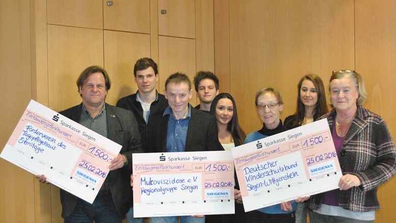 Grund zur Freude hatten in diesem Jahr drei hiesige Organisationen, die unter den Vorschlägen der Mitarbeitenden ausgewählt wurden: Der Förderverein des Tagespflegehauses Eremitage in Wilnsdorf, die Regionalgruppe Siegen des Vereins „Mukoviszidose e. V.“ sowie der Deutsche Kinderschutzbund, Kreisverband Siegen-Wittgenstein. Sie erhielten heute von den Azubis der SIEGENIA GRUPPE einen Scheck über jeweils 1.500 Euro.