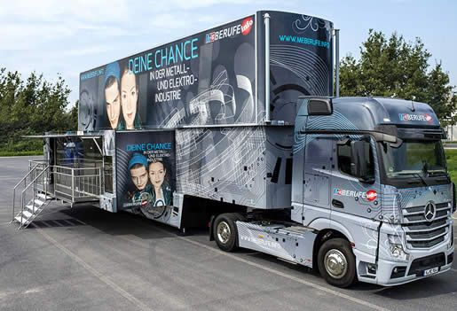 Die zweigeschossigen Trucks mit ihren rund 80 Quadratmetern Präsentationsfläche bieten Schülern, aber auch Eltern, die Möglichkeit, typische Arbeitsplätze der M+E-Industrie mit ihren technischen Zusammenhängen zu erkunden und vor allem auszuprobieren. So können sie unter anderem eine computergesteuerte CNC-Fräsmaschine programmieren und ein Werkstück selbst fertigen. Ein Aufzugmodell demonstriert anschaulich, warum eine intelligente IT-Steuerung die Wartezeit für die Nutzer deutlich reduziert. Begleitet werden die Exponate durch interaktive Aufgabenstellungen und Hintergrundinfos auf Tablets. Hinzu kommt ein sogenannter „BerufeScout“ auf einem lebensgroßen Touch-Monitor. Der erklärt wichtige Inhalte zu den M+E-Berufen und zeigt das Ausbildungsangebot sowie freie Lehrstellen von Unternehmen in der Region.