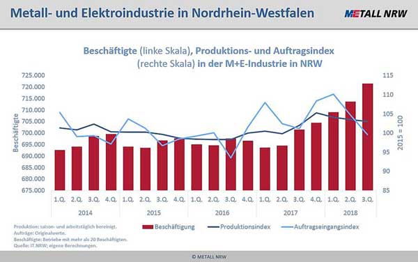 Im Vergleich zum zweiten Quartal 2018 sanken die Aufträge der nordrhein-westfälischen Metall- und Elektroindustrie im dritten Quartal 2018 um 4,9 Prozent. Dabei entwickelte sich die Auslandsnachfrage mit einem Minus von 5,8 Prozent besonders unerfreulich. Die Binnennachfrage sank im selben Zeitraum um 3,8 Prozent. Nur der sonstige Fahrzeugbau konnte im Vergleich zum Vorquartal zulegen (+13,8 Prozent). Besonders deutlich sanken die Aufträge der Automobilbranche. Ein im Vergleich zum Vorquartal 18,7 Prozent geringeres Auftragsvolumen aus dem Ausland führt zu einem Gesamtrückgang um 12,4 Prozent. Lediglich der Maschinenbau konnte das Niveau der Auftragseingänge mehr oder minder halten. Aufgrund einer leicht schwächelnden Binnennachfrage sank das Auftragsvolumen um 0,2 Prozent.