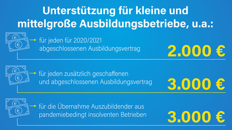 - Unternehmen erhalten eine Prämie von 3.000 Euro für jeden Auszubildenden, den sie von pandemiebedingt insolventen Betrieben aufnehmen.