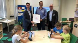 Grundschüler sitzen vor einem Tablet. Vor ihnen liegt ein unvollständiger Quader auf dem Tisch, dem jedoch einige Teile fehlen. Mit einem CAD-Programm konstruieren die Schüler am Tablet…