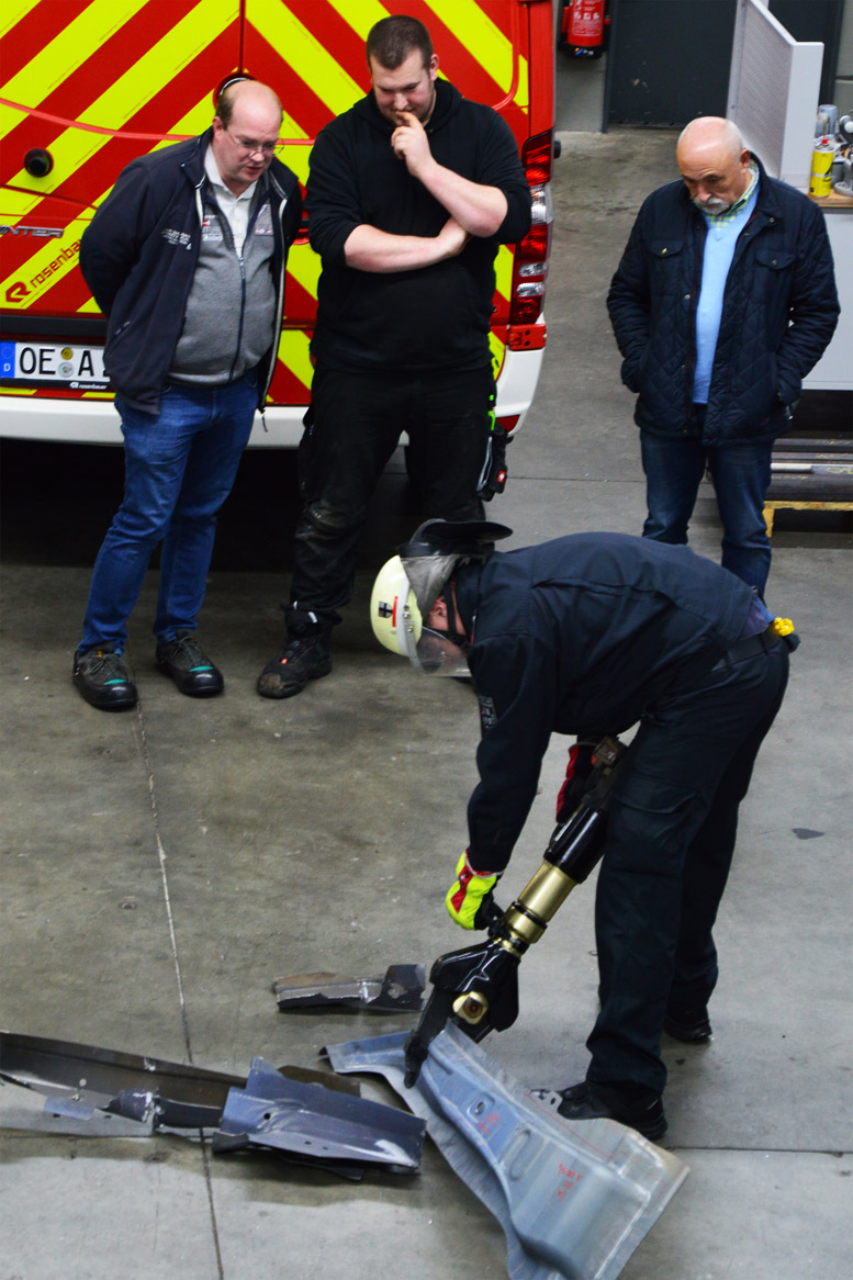 Um auch zukünftig korrekt und sicher bei Unfällen handeln zu können und die Komplexität hochfester Stähle zu verstehen, hat die GEDIA Gebrüder Dingerkus GmbH in Attendorn die Feuerwehr Meinerzhagen eingeladen. Zunächst fand ein Betriebsrundgang statt, bei dem der Prozess der Herstellung hochfester Karosseriebauteile von GEDIA vorgestellt und erläutert wurde. Im neuen Ausbildungszentrum demonstrierten einige GEDIAner, die auch Teil der freiwilligen Feuerwehren Attendorn und Ennest sind, das optimale Vorgehen an Karosseriebauteilen bei Verkehrsunfällen. Vor Ort wurde veranschaulicht in welchen Bereichen es überhaupt möglich ist, die Bauteile mit modernsten hydraulischen Rettungsgeräten zu zerschneiden. Dabei wurden die Belastungsgrenzen der Werkzeuge sehr stark ausgereizt.