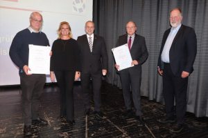 Anschließend nutzte er die Gelegenheit und zeichnete Gregor Kölsch, Ausbildungsleiter bei der Unternehmensgruppe Hees Bürowelt, mit der silbernen Ehrennadel der Handwerkskammer Südwestfalen aus. KH-Geschäftsführer Jürgen Haßler bekam von Jochen Renfordt die goldene Ehrennadel der Handwerkskammer Südwestfalen für sein herausragendes Engagement im heimischen Handwerk verliehen.