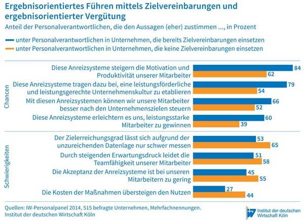 Laut einer Befragung von Personalverantwortlichen im IW-Personalpanel 2014 werden in 51 Prozent der Unternehmen zumindest für einen Teil der Belegschaft Ziele vereinbart und Mitarbeiter ergebnisorientiert vergütet. Mitarbeiter mit Führungsverantwortung werden selbst am häufigsten ergebnisorientiert geführt. In jedem dritten Unternehmen werden Ziele auch mit Mitarbeitern ohne Führungsverantwortung vereinbart. Personalleiter und Geschäftsführer in Unternehmen, in denen es (noch) keine Zielvereinbarungsgespräche und ergebnisorientierte Vergütungsbestandteile gibt, bewerten die potenziellen Chancen deutlich zurückhaltender (siehe Abbildung) als Personalleiter, die bereits Erfahrung damit haben. Zielvereinbarungen werden dabei aus folgenden Gründen genutzt: