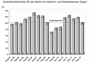 Siegen, 9. Oktober 2012. „Die Konjunktur im Bezirk der Industrie- und Handelskammer Siegen (IHK) ist aktuell noch ganz robust“, so Klaus Th. Vetter. Der IHK-Präsident erläuterte im Rahmen einer Pressekonferenz die Ergebnisse der jüngsten Konjunkturumfrage, an der sich 540 Unternehmen aus Industrie, Handel und Dienstleistung beteiligt hatten. Auslastung und Beschäftigung sind bei der Mehrzahl der Industriebetriebe gut. Im Dienstleistungssektor sind Zeichen für eine Abschwächung nur vereinzelt zu erkennen. Gegen die Störfeuer, denen die Konjunktur immer mehr ausgesetzt ist, sind allerdings auch die Unternehmen in Siegen-Wittgenstein und Olpe nicht immun. „Die Zeichen für die nächsten Monate stehen daher eindeutig auf Abkühlung“, so Vetter.