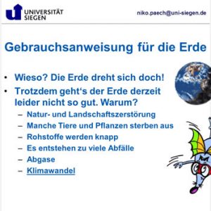 Wie das gehen kann, erklärte der Volkswirt Prof. Dr. Niko Paech (Uni Siegen) bei der ersten digitalen Kinderuni den Teilnehmerinnen und Teilnehmern vor den heimischen Computern. „Unsere Erde ist in keinem guten Zustand“, erläuterte der Plurale Ökonom eingangs. Natur- und Landschaftszerstörung führten dazu, dass Tiere und Pflanzen aussterben. Rohstoffe werden knapp, Abfallberge wachsen, immer mehr Abgase tragen zum Klimawandel bei. In der Folge kommt es zu immer mehr Dürrekatastrophen und Überschwemmungen.