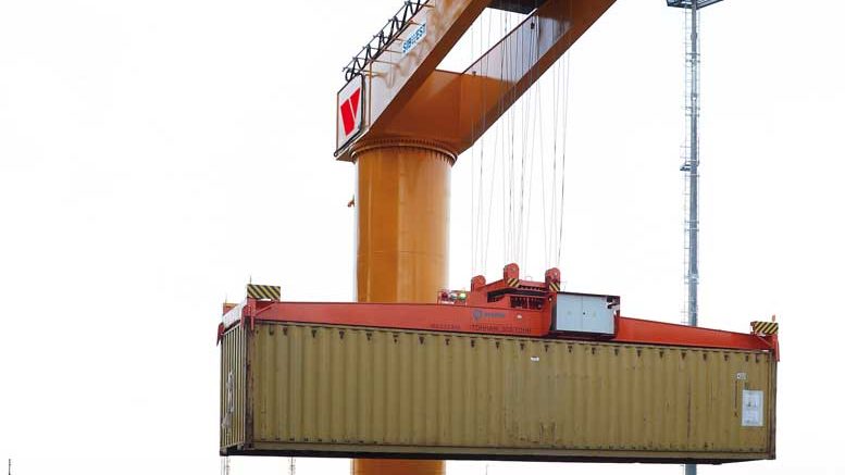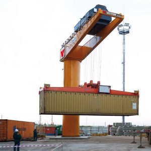 Der Doppelausleger besteht aus geschweißten Kastenträgern mit einer Auslegerlänge von 12 Meter. An der Auslegespitze hat der Kran eine Tragfähigkeit von 40 Tonnen, sodass alle handelsüblichen Container verladen werden können. Die Schwenkbewegungen 360 Grad unendlich erfolgen über mehrere Antriebsmotore, ebenso die Fahr-Hub-und Senkbewegungen des Hubwerkes, das auf dem Ausleger einen 10 Meter langen Verfahrweg hat. Die Container werden mit mit einer Spezialtraverse aufgenommen, einem sogenannten Spreader. Das Besondere: Alle Bewegungen des Kranes einschließlich der Aufnahme des Containers werden durch Fernsteuerung von nur einer Person ausgeführt, die als Kranführer vor Ort von den Servicemitarbeitern der Vetter Krantechnik GmbH eingewiesen wurde. Als technische Schwierigkeit erwiesen sich die enormen Temperaturschwankungen von -40° C Grad im Winter bis +40° C Grad im Sommer. Aus diesem Grund wurden Spezialstähle mit Kälteeigenschaften eingesetzt und alle beweglichen Teile besonders geschützt. Aufgrund des großen Temperaturbereichs wurden zusätzlich empfindliche Bauteile mit verschiedenen Schutzsystemen ausgestattet. Unter anderem gibt es Heizpatronen im Ölbad der Getriebe, um die notwendige Viskosität des Öls sicherzustellen. Die auf dem Ausleger verfahrbaren Hubwerke wurden komplett in einer ebenfalls mitfahrenden Einhausung untergebracht, die entsprechend geheizt oder gekühlt wird. Alle Motore wurden mit Kaltleiterfühler ausgestattet, die vor Ausfall durch Überhitzung schützen.