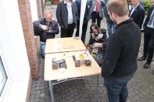 Da ist zum einen ein neuartiger Dämmputz, der neben Zement und Kalk auch geschreddertes Altglas und natürlich gehäckselte Federn enthält. Die Poliere der Firma Berge-Bau aus Erndtebrück, die den Putz in einer Live-Vorführung verarbeiteten, waren von seiner Konsistenz und Geschmeidigkeit angetan. Außerdem ließ er sich ohne Probleme auch auf eine Wand ohne vorherige Grundierung aufbringen.