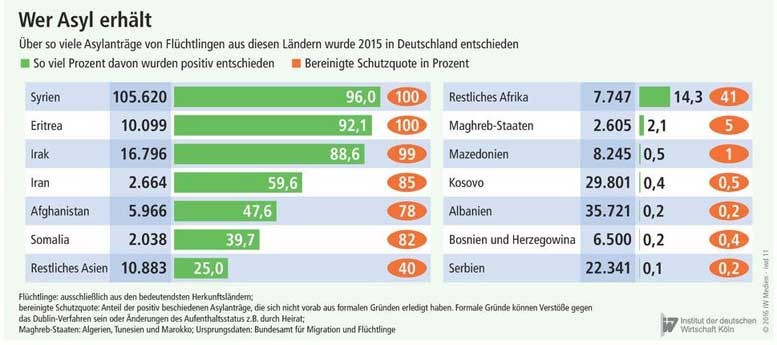 Die Anerkennungsquote von Asylbewerbern aus Syrien, Eritrea und dem Irak liegt derzeit bei 90 Prozent und mehr. Anders sieht die Bleibeperspektive für Flüchtlinge aus den Balkanstaaten aus. Antragsteller aus dem Kosovo, Mazedonien, Montenegro, Serbien sowie Bosnien und Herzegowina erhalten in weniger als einem von hundert Fällen eine Anerkennung. Außerdem betrachtet Deutschland diese Staaten inzwischen als sichere Herkunftsländer, weshalb Asylbewerber, die nach dem 31. August 2015 einen Antrag auf Asyl gestellt haben, einem Beschäftigungsverbot unterliegen.