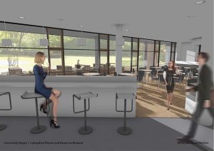 Einer der Studenten präsentierte die Idee, durch neue öffentliche Nutzungen im Gebäude (z.B. Arztpraxen, Kita etc.) den Unternehmenskomplex stärker mit dem Umfeld zu verbinden. Das könnte mehr BürgerInnen ins Gebäude bringen.
