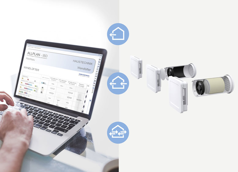 Über Allplan Design2Cost können Architekten und Planer auf sämtliche Lüftungsgeräte von SIEGENIA zugreifen. Die bedarfsgerechte Auswahl wird durch Piktogramme mit den Eigenschaften und Einbaumöglichkeiten des jeweiligen Lüfters unterstützt.