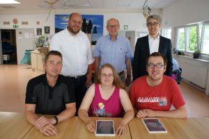 Werkstattleiter Marc Brüggemann freut sich über die Tablets: „Damit ist jetzt individuelles kognitives Training, die Förderung von Konzentration und das freie Lernen jenseits von statischen Inhalten möglich. Außerdem erlangen die Teilnehmer wichtige Kompetenzen im Umgang mit Online-Medien.“ Janine Ehrich und Kevin Schneider zeigen während der symbolischen Übergabe der Geräte, wie schnell ein routinierter Umgang mit den neuen Geräten gelingt: Beide bewegen sich innerhalb kürzester Zeit zusehends sicherer in Zahlenräumen und spielerischen Tests. Mit Spaß und viel Lerneifer erobern sie die digitale Welt. „Neben unseren standardisierten Tests kann nun spezielle digitale Lernsoftware zum Einsatz kommen, um für jeden die richtige Balance zwischen Lernziel und Förderung zu finden“, so Gruppenleiter Armin Irmler. „Menschen Arbeit und somit Teilhabe an der Wirtschaftskraft dieser Region zu ermöglichen, auch das ist für uns von karriere-suedwestfalen.de ein wichtiges Kapitel der Erfolgsgeschichte Südwestfalens“, so Felix Berghoff, Geschäftsführer von karriere-suedwestfalen.de. Gemeinsam mit Stiftungsvorstand Bernd Lepping freut er sich darüber, dass die digitalen Hilfsmittel innerhalb kürzester Zeit schon nicht mehr aus dem Berufsbildungsbereich wegzudenken sind.