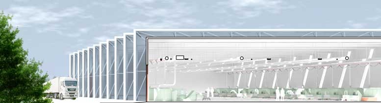 Der Hallenaufbau erfolgt über eine sogenannte Sheddach-Konstruktion, die ohne Stützen auskommt. Der Vorteil von Sheddächern ist, dass die Grundfläche des Bauwerks minimiert werden kann und eine Ausleuchtung durch den natürlichen Lichteinfall aus Norden blendfrei ohne Bildung von Schlagschatten ermöglicht wird.