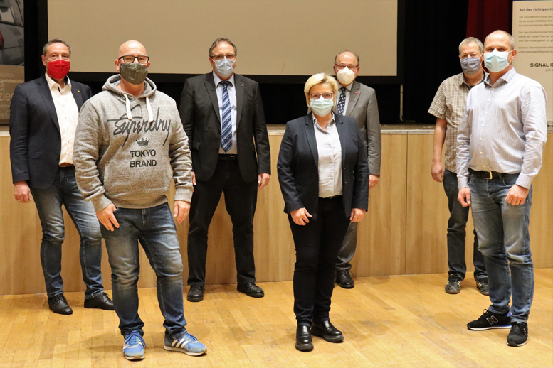 Der Vorstand der Elektro-Innung Siegen und KH-Geschäftsführer Jürgen Haßler (v.l.).: Stellvertretender Obermeister Frank Klein, Rüdiger Bittner, Obermeister Bernd Elter, stellvertretende Lehrlingswartin Meike Rothenpieler, Jürgen Haßler, Lehrlingswart Michael Weber, Daniel Kapciak