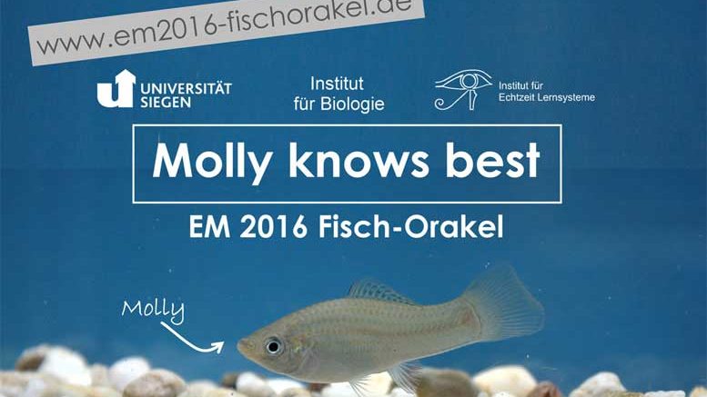 Das legendäre WM-Orakel Paul hat eine wissenschaftliche Nachfolgerin. Sie heißt Molly und ist ein Breitflossenkärpfling. In den kommenden Wochen wird sie in den Forschungslaboren des Instituts für Biologie an der Universität Siegen die Ergebnisse der Partien der EM 2016 mit deutscher Beteiligung vorhersagen – im Dienste der Wissenschaft. Molly ist Teil des interdisziplinären Forschungsprojekts „Virtuelle Fische“.