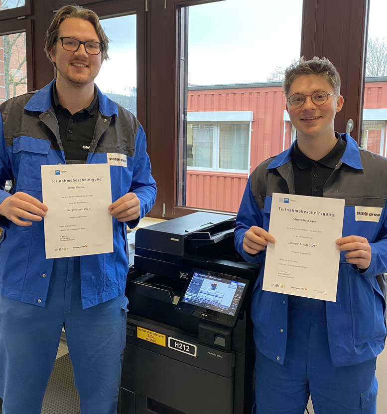 Sehr angetan waren Roger Schmidt und der zweite Juror Markus Schumacher (Effizienz-Agentur NRW) ebenfalls von der Arbeit der zweitplatzierten Projektgruppe. Die Auszubildenden der SMS group GmbH (Hilchenbach) hatten sich als besonders innovativ erwiesen, indem sie ein Potenzial aufdeckten, das nicht auf den ersten Blick ins Auge fällt. Sie fanden heraus, dass an den Multifunktionskopierern in ihrer Firma Bewegungsmelder installiert sind, die dafür sorgen, dass sich die Geräte einschalten und hochfahren – dies aber unnötigerweise auch immer dann, wenn eine Person nur durch die Flure schreitet. Die gewonnenen Erkenntnisse und die einfache Umsetzung investitionsarmer Maßnahmen, unter anderem Änderungen im Menü der Geräte, machen deutliche Einsparungen möglich und lassen sich zudem auf viele weitere IT-Endgeräte projizieren. Einen klaren Mehrwert erzielte auch das Projekt der SSI Schäfer Fritz Schäfer GmbH (Neunkirchen). Im Mittelpunkt hier: die Beleuchtung in den Aufzügen.