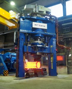 Im Werk von Gustav Grimm in Remscheid schmiedet die 31,5/34-MN-Hochgeschwindigkeits-Freiformschmiedepresse der SMS group ihren ersten Block.