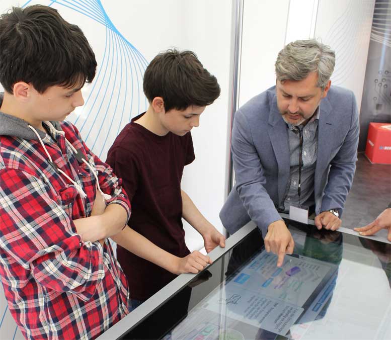 In der zweiten Fahrzeugebene ist Platz für tiefer gehende Informationen. Das Highlight ist der 1,5 Quadratmeter große Multitouchtable: Hier können bis zu sechs Besucher/innen gleichzeitig Arbeitsplätze und Berufe der M+E-Industrie erkunden und selber an der Produktion eines Autos mitwirken. Dabei stehen berufstypische und interaktive Aufgabenstellungen im Vordergrund.