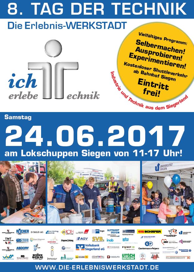 Am 24. Juni 2017 findet der Tag der Technik in Siegen bereits zum 8. Mal statt. Auf dem Busbereitstellungsplatz neben dem Lokschuppen kann dann wieder einen ganzen Tag lang vom morgens 11.00 Uhr bis nachmittags 17.00 Uhr geschraubt, gesägt, gegossen, geschweißt, gestaunt und experimentiert werden. „Mit dieser Veranstaltung möchten wir den Menschen in unserer Region zeigen, was unsere Unternehmen so alles drauf haben und was uns bis heute wirtschaftlich stark macht“, so Helmut Hofmann von den Arbeitgeberverbänden Siegen-Wittgenstein.