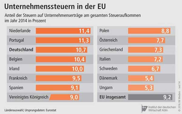 Im Schnitt aller EU-Länder kam 2014 fast jeder zehnte Steuer-Euro aus den Erträgen der Unternehmen.