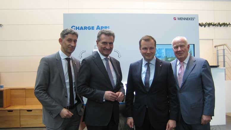 Günther Oettinger, EU-Kommissar für Digitale Wirtschaft, besuchte auf seinem Rundgang über die Hannover Messe auch den Messestand der MENNEKES Elektrotechnik GmbH & Co. KG. Hier erläuterten Walter und Christopher Mennekes sowie Geschäftsführer Volker Lazzaro das neue Vermarktungskonzept „Charge up your day!“ mit intelligenten Ladelösungen für die Elektromobilität.