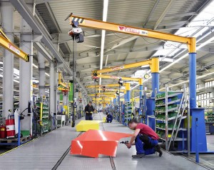 Nachdem Kemper die ersten mobilen Schwenkkrane von Vetter einsetzte, erkannte man schnell die Vorteile: Die Krane haben ihr Fundament im Kransockel integriert und lassen sich mit Hilfe eines Gabelstaplers schnell an die Orte versetzen, an denen die Mitarbeiter sie brauchen. Anders als bei stationären Schwenkkranen kommt so der Kran zum Arbeitsplatz, nicht umgekehrt. Dieses Arbeitsplatzmodell ist so erfolgreich, dass Kemper seitdem mehr als 30 solcher Wanderkrane in Betrieb genommen hat. Sie stehen in erster Linie am Endmontage-band sowie in den Montageboxen für Sondergeräte, aber auch in den Schweiß-kabinen. Im Grunde eignen sie sich für fast alle Arbeitsplätze in der Produktion.