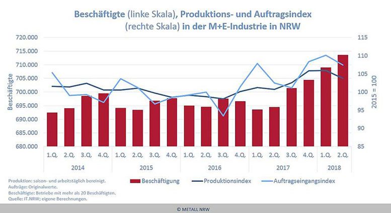 Nach Angaben von METALL NRW, dem Verband der Metall- und Elektro-Industrie Nordrhein-Westfalen e.V., musste die M+E-Industrie in NRW im zweiten Quartal 2018 im Vergleich zum Vorquartal einen Rückgang der Produktionsleistung von 0,9 Prozent (saison- und arbeitstäglich bereinigt) verzeichnen – allerdings auf hohem Niveau. Im Vergleich zum Vorjahreszeitraum stieg die Produktionsleistung um 2,9 Prozent. Im Vorquartalsvergleich konnten lediglich die Maschinenbauer (plus 0,8 Prozent) zulegen, während in den übrigen Branchen die Produktionsleistung im Vergleich zum Vorquartal zurückging. Die Produktion der Automobilbranche sank um 2,0 Prozent, die der Hersteller von Metallerzeugnissen um 1,8 Prozent.  Die Hersteller von DV-Geräten sowie elektronischen und optischen Erzeugnissen mussten nach sechs Quartalen Wachstum ebenso Federn lassen, die Produktion sank um 1,1 Prozent. Im Vergleich zum Vorjahreszeitraum konnten hingegen fast alle M+E-Teilbranchen zulegen: Der Automobilbau um 9,5 Prozent, der Maschinenbau um 4,3 Prozent, die Hersteller von DV-Geräten, elektronischen und optischen Erzeugnissen um 3,0 Prozent, die Hersteller von elektrischen Ausrüstungen um 1,3 Prozent. Lediglich die Hersteller von Metallerzeugnissen mussten einen Rückgang von 0,8 Prozent hinnehmen.