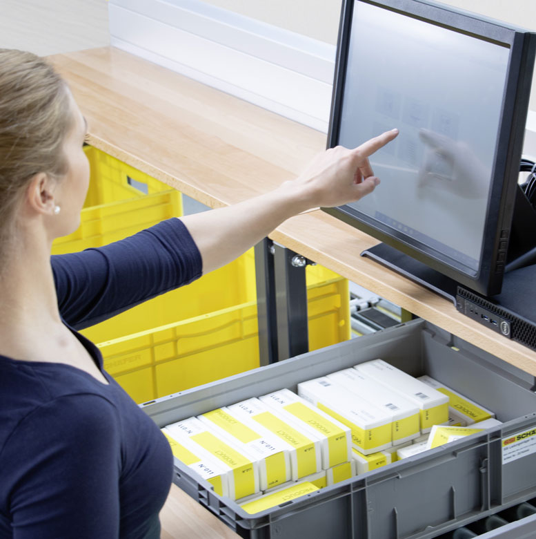 Bei der Entwicklung der Arbeitsstation war SSI Schäfer darauf bedacht, eine nachhaltige Lösung zu kreieren. Energieeffizienz lautete daher ein wichtiges Ziel. Dieses wurde durch die Anwendung der neuesten Antriebstechnik für die Rollen umgesetzt, welche die aktuellen Standards und Normen erfüllt. Der Arbeitsplatz selbst kann ohne Pneumatik betrieben werden und ist daher sehr energiesparsam. Indem die Kontaktflächen an der Kommissionierstation in berührungsfreundlichem Holz gehalten sind, also aus einem nachwachsenden Rohstoff bestehen anstelle beispielsweise aus Kunststoff, leistet SSI Schäfer ebenfalls einen Beitrag zur Nachhaltigkeit.