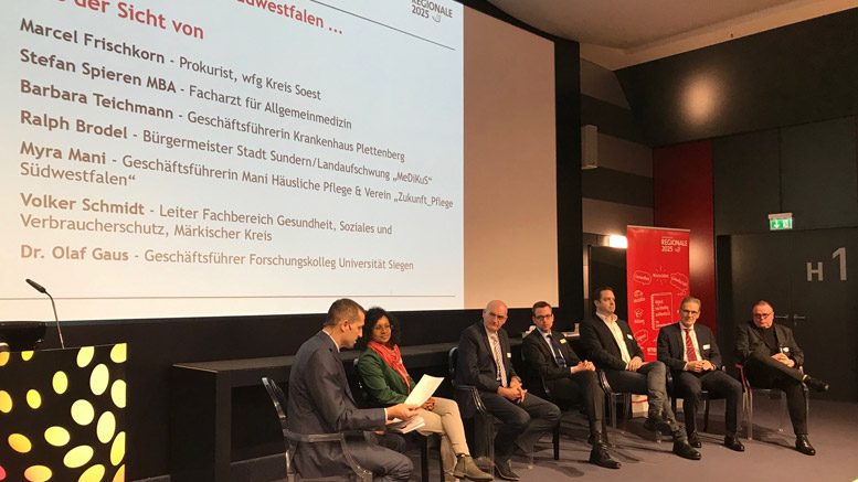Dass es in Südwestfalen einige zukunftsfähige Lösungsansätze und Projekte gibt, um die ärztliche und pflegerische Versorgung in der Region zu verbessern und dem Mangel an medizinischen Fachkräften entgegenzuwirken, wurde in der Podiumsdiskussion deutlich. Ralph Brodel, Bürgermeister der Stadt Sundern, erläuterte das Modellprojekt MeDiKuS, für das sich Stadt und Universität Siegen zusammengetan haben, um zu untersuchen, wie medizinische Leistungen durch digitale Lösungen unterstützt werden können. Marcel Frischkorn, Prokurist der Wirtschaftsförderung wfg im Kreis Soest und sogenannter „Hausarzt-Kümmerer“, holt die so dringend benötigten Ärzte seit 2018 in den Kreis Soest – mit Erfolg. Oder Dr. Stefan Spieren, Facharzt für Allgemeinmedizin in Wenden, der digital bereits gut aufgestellt ist und seinen Patienten beispielsweise Videosprechstunden anbietet. Und Myra Mani aus Lüdenscheid, Geschäftsführerin eines Pflegedienstleisters, ist Gründungsmitglied des Vereins „Zukunft_Pflege_Südwestfalen“, der das Image der Pflegebranche stärken, Nachwuchskräfte gewinnen und die Zusammenarbeit der Pflegebetriebe fördern will.