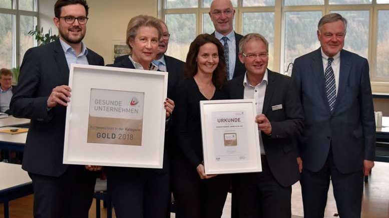 Für ihr engagiertes betriebliches Gesundheitsmanagement mit einem breitgefächerten Angebot für die Beschäftigten wurde die Gustav Hensel GmbH & Co. KG in Lennestadt jetzt geehrt. In einer Feierstunde fand die offizielle Übergabe der Auszeichnung „GESUNDE UNTERNEHMEN“ statt. Als erstes Unternehmen im Kreis Olpe wurde das Unternehmen mit dem Siegel in Gold ausgezeichnet. „Gesunde, zufriedene und motivierte Mitarbeiter sind für alle Unternehmen wichtiger denn je. Die Herausforderungen von Fachkräftemangel und demografischem Wandel hat Hensel rechtzeitig erkannt und wirkt dem aktiv entgegen“, so Katja Weigand, Geschäftsführerin der Trägerinstitution IFU – Institut für Unternehmenswerte –, die die Initiative GESUNDE UNTERNEHMEN deutschlandweit vertritt. Sie überreichte Philipp C. Hensel als Geschäftsführer des Unternehmens das Auszeichnungssiegel und die Urkunde.