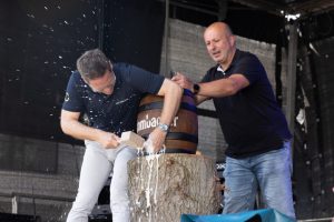 Der Geschäftsführende Gesellschafter Mark Georg eröffnet mit dem Fassanstich das Jubiläums-Familienfest.